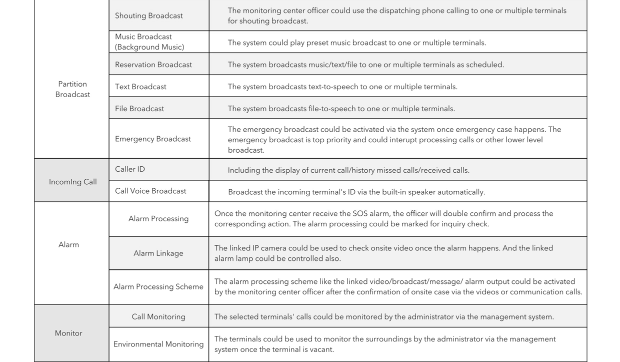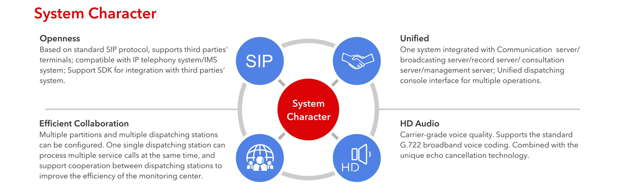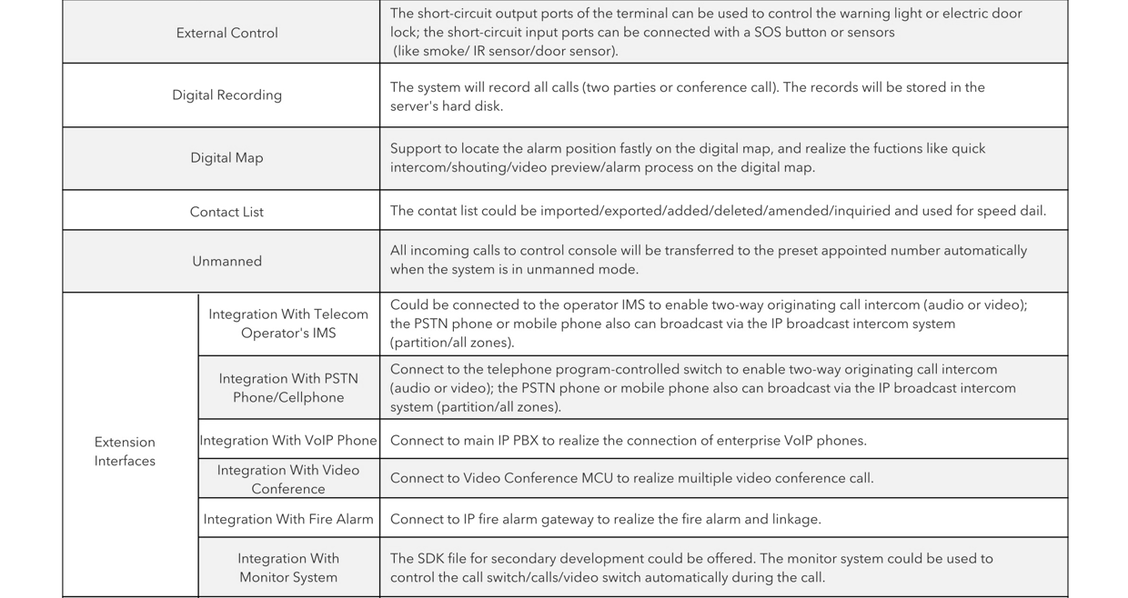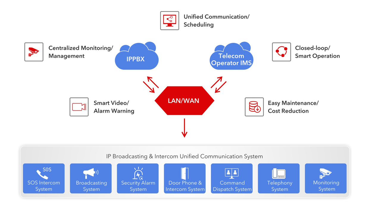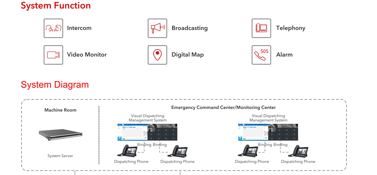 The system could be configured easily. Only need to connect the devices to LAN or WAN network to setup a powerful digital communication system which can realize the integration of multiple networks systems including computer network, SOS help, public broadcasting, video monitoring, security alarm and office telephone. The system could be widely applied to multiple industries like highways, unmanned parking lot/sports hall/gym/supermarket, industry mine, education, rail, finance, prison, energy, electricity, medical, intelligent building and others.
