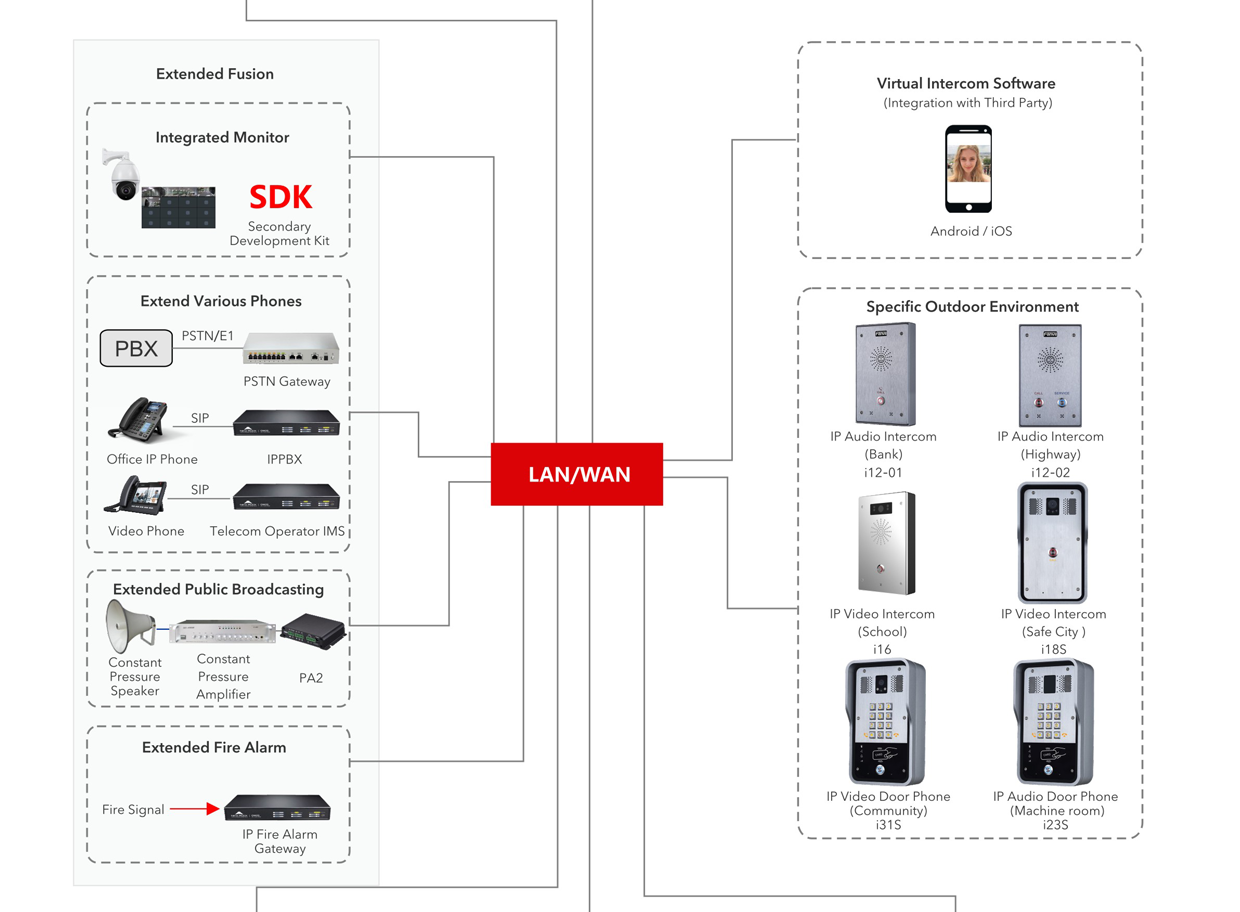 Fanvil IP Broadcasting & Intercom Unified Communication system is a one-stop solution based on IP communication protocol and standard SIP protocol as core protocol, combining with Help Intercom, SOS call, Emergency Broadcasting, Emergency Consultation, Visualized Dispatch, Real-time Recording, Video Linkage, Alarm Linkage and Digital Map. The system can be integrated with other systems deeply to improve the industry information management, reduce the enterprise operation and maintenance management cost, and improve daily work efficiency and emergency response capability.