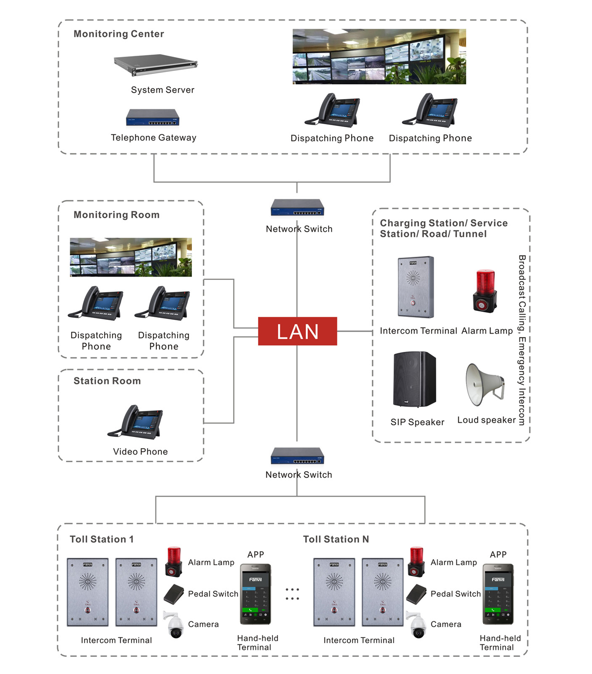 The system could be applied to highway daily management to realize the intelligent operation and improve the efficiency via the integration of intercoms in highway toll booths, emergency assistance, emergency broadcasting, monitoring center and office communication systems. The system could be used with existing network for internal communication between toll booth, station monitor room and monitoring.
